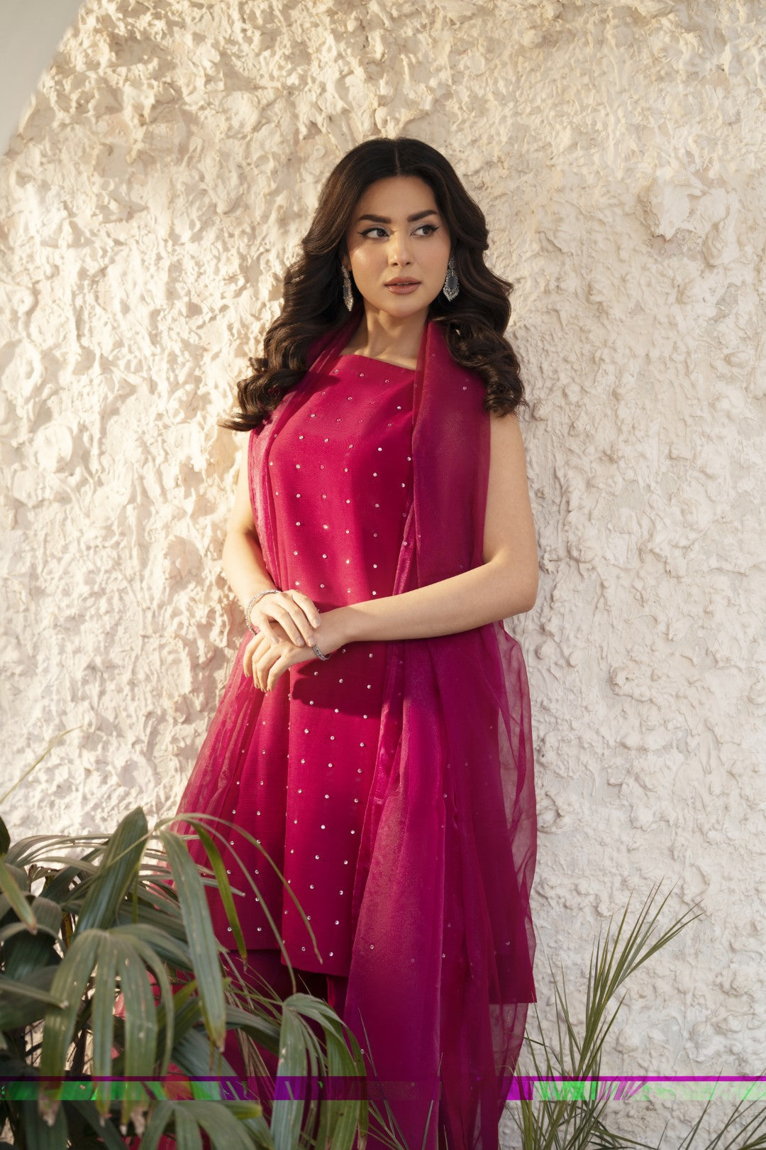 This ensemble features a chic shirt embellished with silver stones, pared with classic shalwar and an organza dupatta is the perfect blending of traditional style with a modern aesthetic.