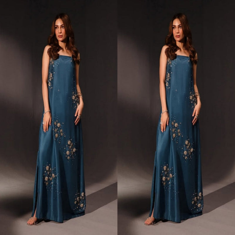 A striking teal blue long shirt with intricate starry embellishments cascading across the fabric, adorned with shimmering silver sequins and a dazzling array of silver and multi-colored stones. Complemented by sleek matching pants, this outfit blends subtle shimmer with contemporary flair.